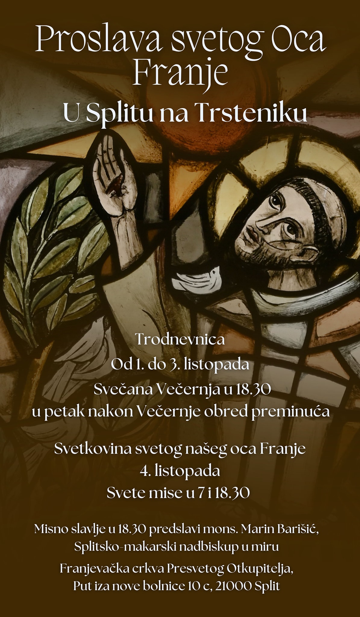 Svečano misno slavlje na dan svetkovine 4. listopada u 18,30 predslavi mons. Marin Barišić, nadbiskup u miru.