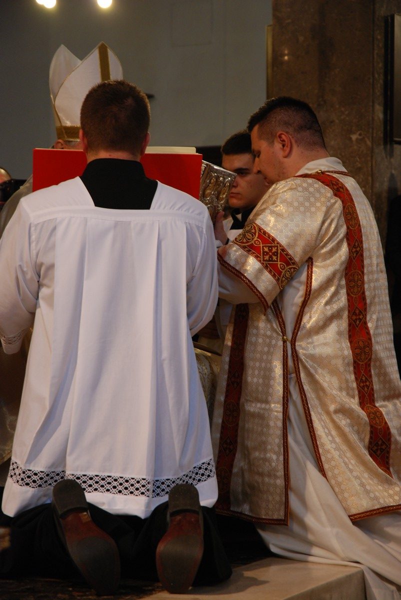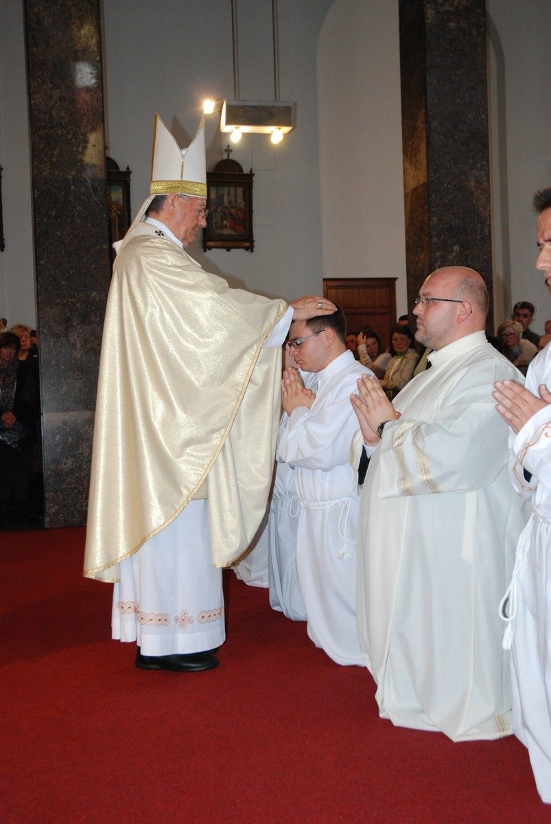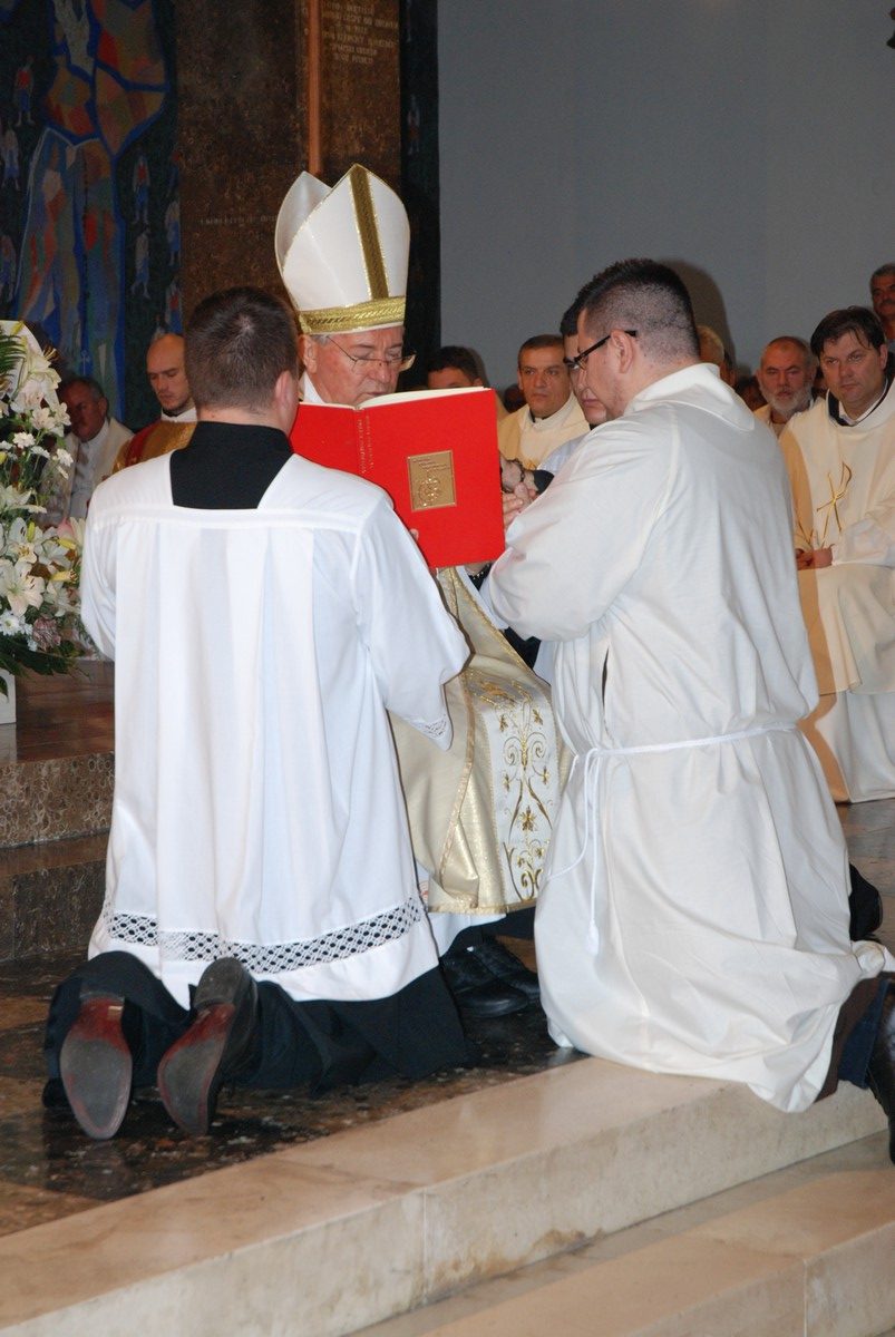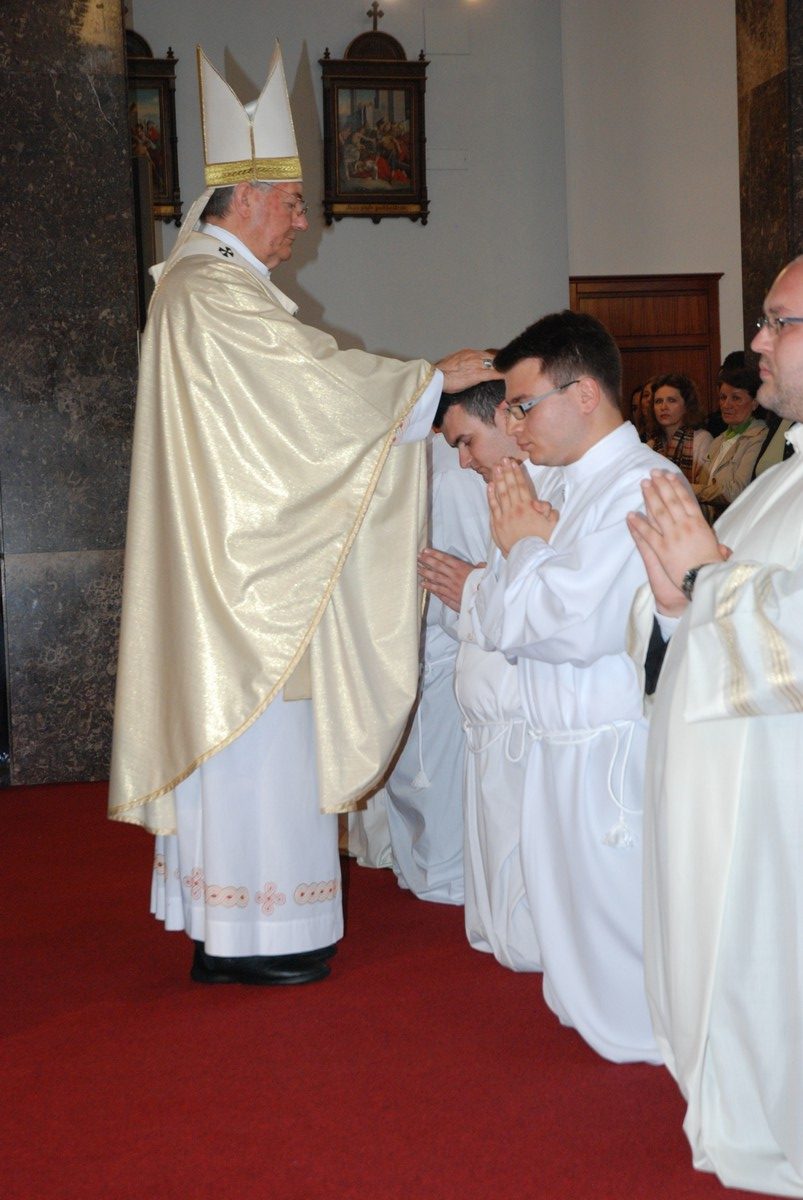 Nakon homilije nadbiskup je polaganjem ruku i posvetnom molitvom kandidatima podijelio sakrament svetoga reda đakonata. Potom su novozaređeni đakoni obukli službenu liturgijsku odjeću: štolu, koja je znak dostojanstva i vlasti, i dalmatiku, simbol spasenja, radosti i pravednosti. Na kraju obreda, đakoni su primili evanđelistar iz nadbiskupovih ruku te s njim izmijenili cjelov mira, a potom su pristupili služenju kod oltara.