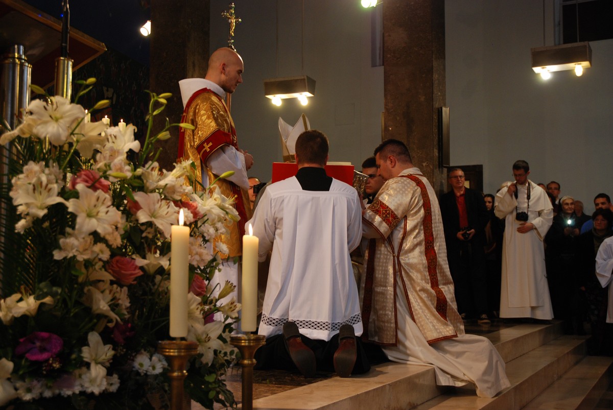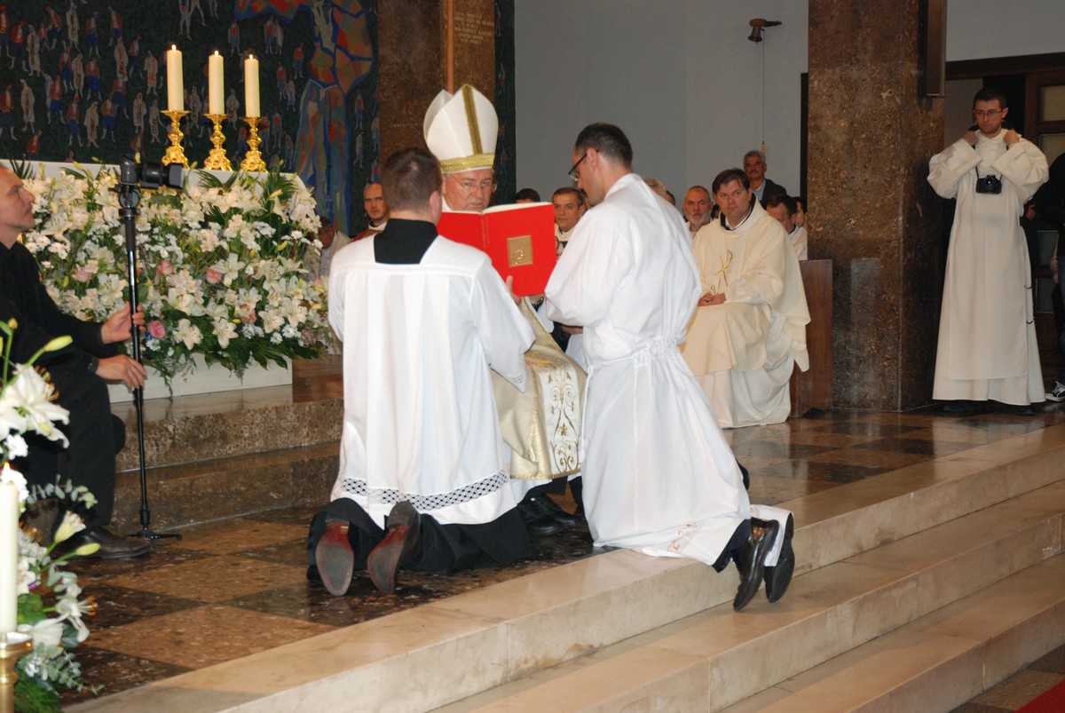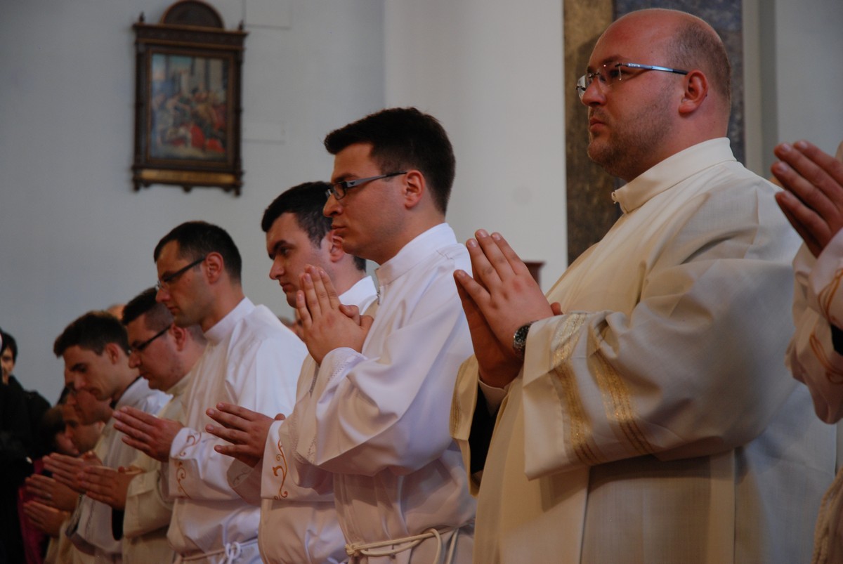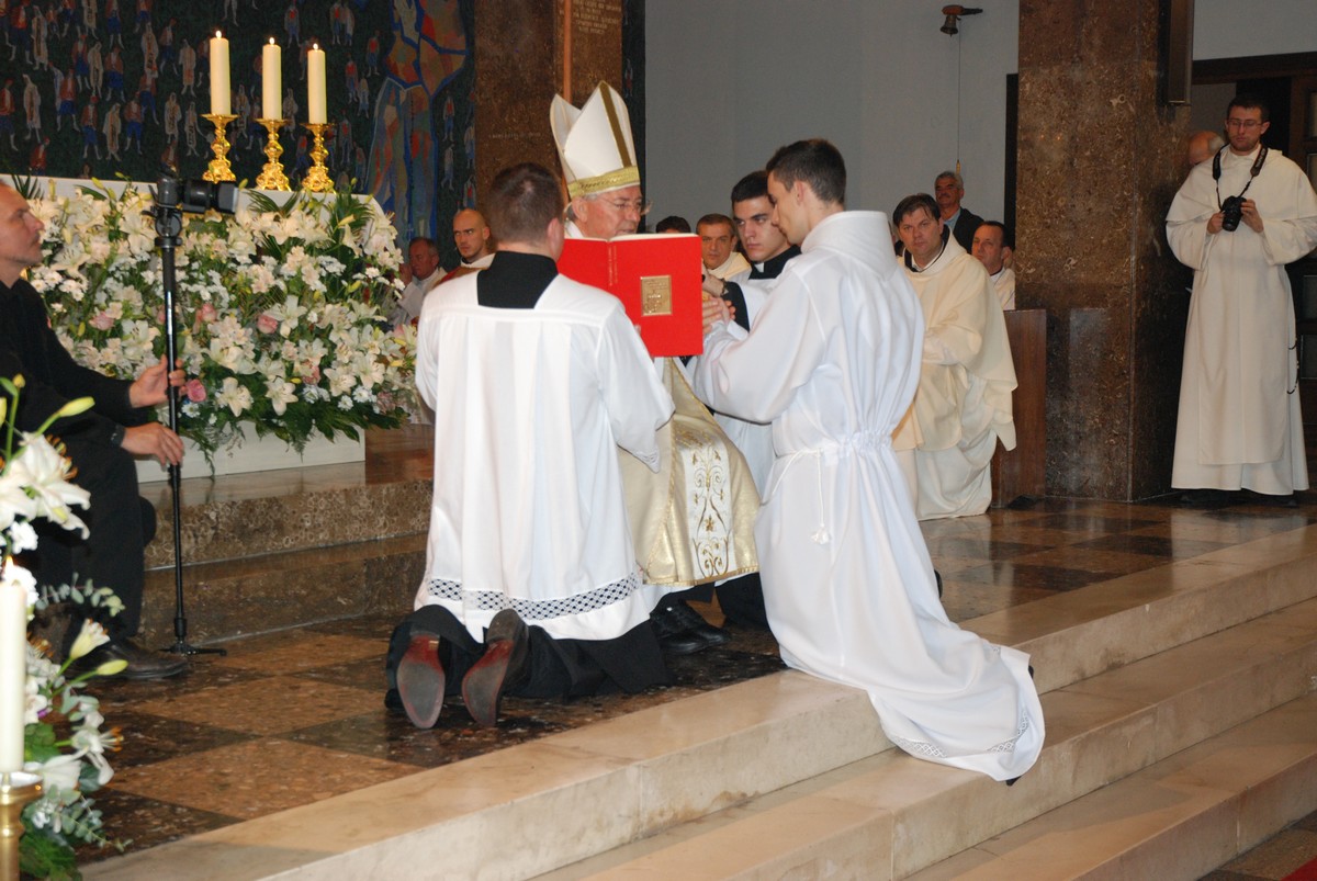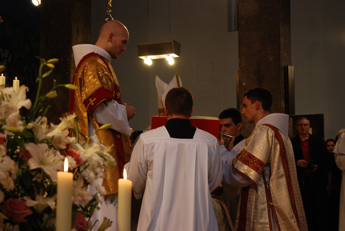Nakon homilije nadbiskup je polaganjem ruku i posvetnom molitvom kandidatima podijelio sakrament svetoga reda đakonata. Potom su novozaređeni đakoni obukli službenu liturgijsku odjeću: štolu, koja je znak dostojanstva i vlasti, i dalmatiku, simbol spasenja, radosti i pravednosti. Na kraju obreda, đakoni su primili evanđelistar iz nadbiskupovih ruku te s njim izmijenili cjelov mira, a potom su pristupili služenju kod oltara.