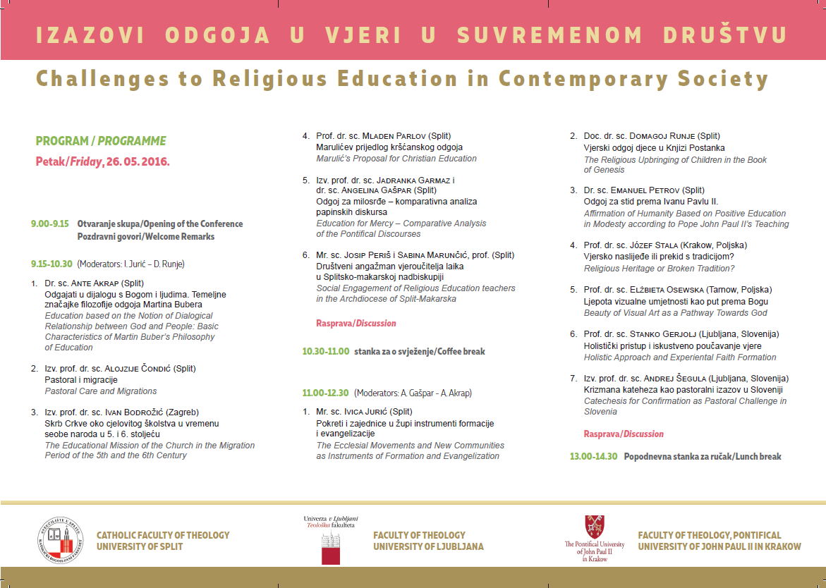 Katolički bogoslovni fakultet Sveučilišta u Splitu, Teološki fakultet Sveučilišta u Ljubljani i Teološki fakultet Papinskog sveučilišta Ivana Pavla II. u Krakovu organiziraju Međunarodni znanstveni skup „Izazovi odgoja u vjeri u suvremenom društvu“ u petak, 26. svibnja u Franjevačkom samostanu o. fra Ante Antića u Splitu.