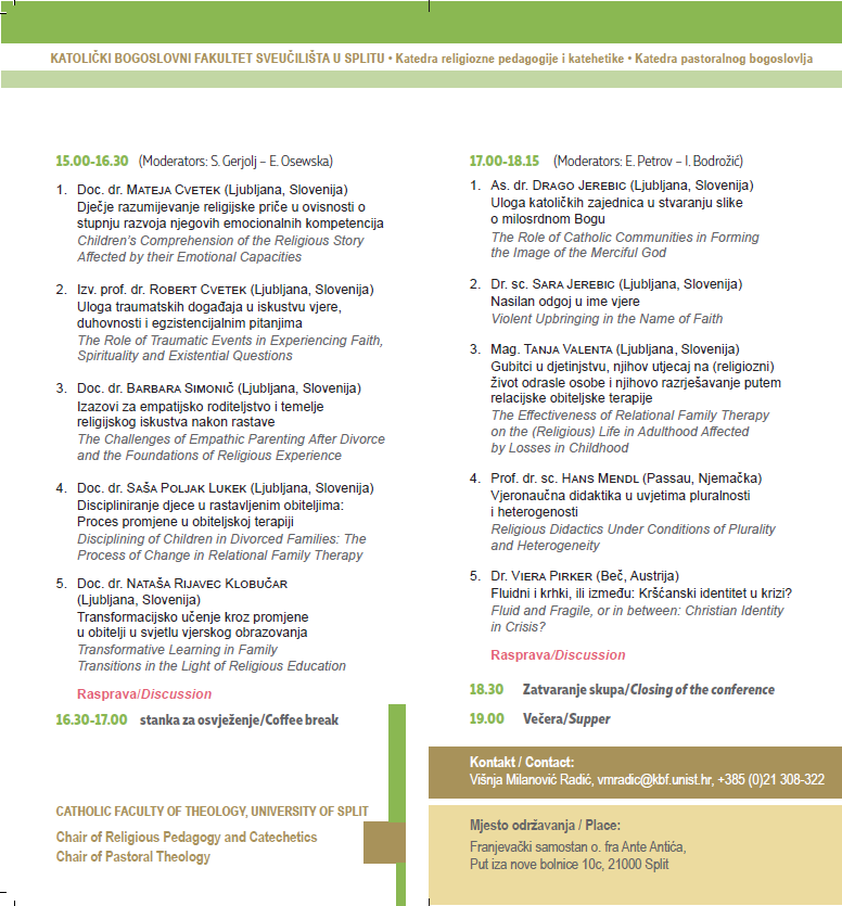 Nakon rasprave i stanke u 17 sati slijedi novi blok izlaganja: as. dr. Drago Jerebic (Ljubljana, Slovenija) „Uloga katoličkih zajednica u stvaranju slike o milosrdnom Bogu“; dr. sc. Sara Jerebic (Ljubljana, Slovenija) „Nasilan odgoj u ime vjere“; mag. Tanja Valenta (Ljubljana, Slovenija) „Gubitci u djetinjstvu, njihov utjecaj na (religiozni) život odrasle osobe i njihovo razrješavanje putem relacijske obiteljske terapije“; prof. dr. sc. Hans Mendl (Passau, Njemačka) „Vjeronaučna didaktika u uvjetima pluralnosti“; dr. Viera Pirker (Beč, Austrija) „Fluidni i krhki, ili između: Kršćanski identitet u krizi?“ Skup završava u 18.30 sati završnom raspravom i zatvaranjem skupa.